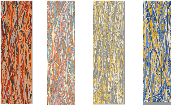 So arbeitet das Programm für die Bilder Bézierlinien: In einem ersten Schritt werden die Start-, End- und Kontrollpunkte für jede der Linien festgelegt. In einem zweiten Schritt werden die daraus resultierenden kubischen Bézierkurven errechnet und gezeichnet. Die Bildstruktur kann durch die Anzahl der Linien, die Lage der Ausgangspunkte, die Dicke der Linien und die Breite des Linienrandes beeinflusst werden.