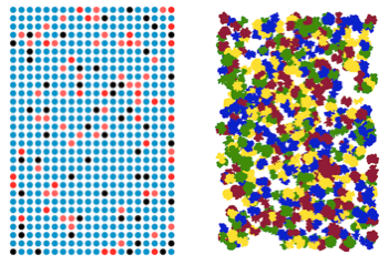 So arbeiten die Programme: Bei 600 Punkte werden in den 30 Reihen und 20 Spalten die Punkte mit drei unterschiedlichen Farben regelmäßig angeordnet. Bei dem Klecksbild kann neben der Anzahl der Punkte und ihrer Farbe (samt Transparenz) auch ihre Form durch mehrfache Überlagerung kleiner Punkte vorgegeben werden.